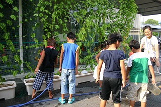 エコセンでは毎日、朝と夕方に水やりをしています。ときどき遊びに来てくれた皆さんと、みどりのカーテンに水やりもしています!!