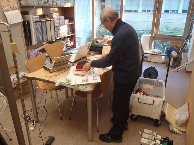 昨日の、山科に出張した 『省エネ相談所』の出張セットを片付け中の ボランティア・京エコサポーター天野さん。
